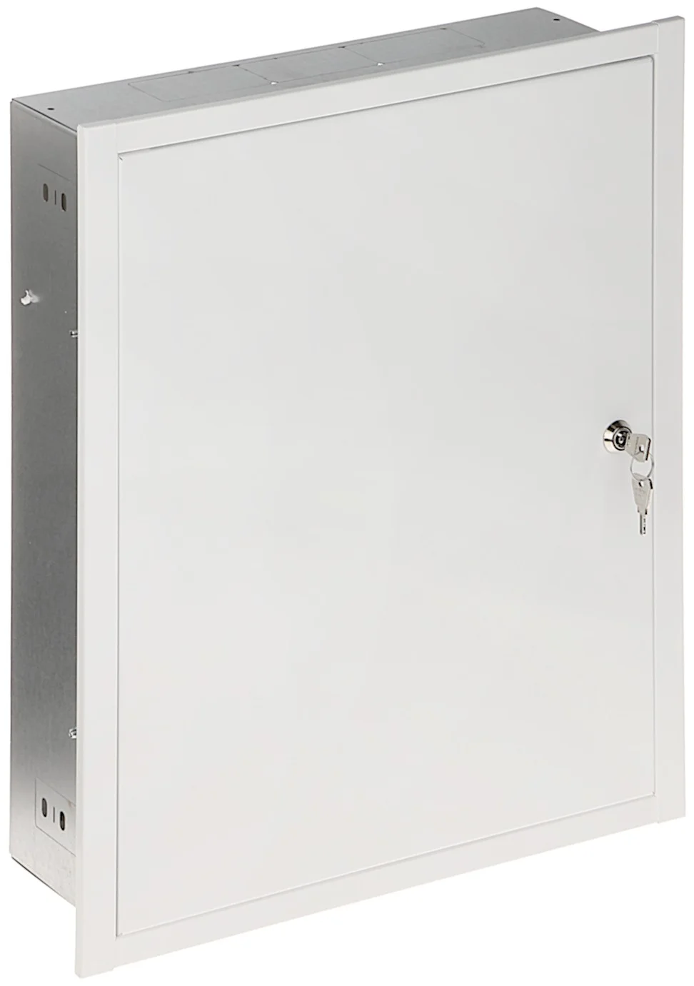 The cabinet is suitable for wall mounting and has a wooden back panel. Knock-out openings for cable entries are provided at the top and bottom. The cabinet comes with two keys.